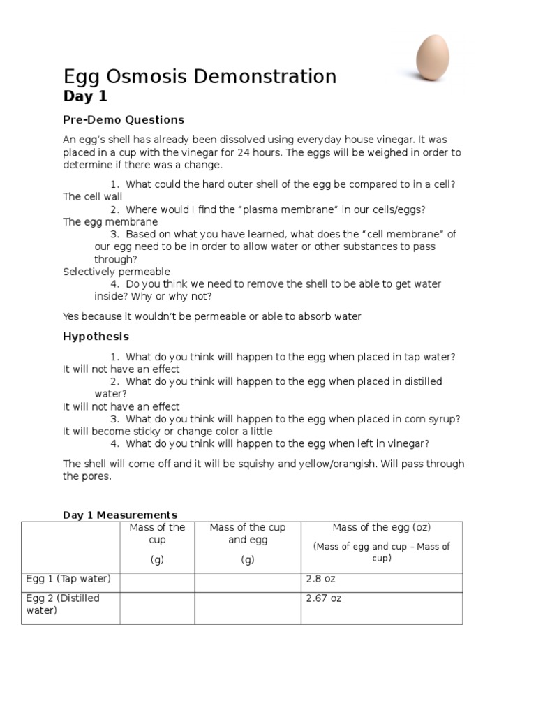 We will expose the chicken egg to a hypertonic environment to make it shrink, and a hypotonic environment to make it swell egg osmosis lab pdf. Right now, as you read this, there are millions of things happening throughout your body.