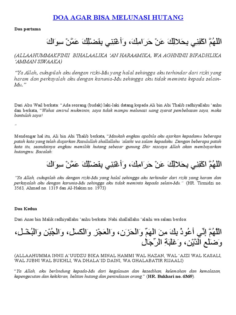 Telah diceritakan dari zuhair bin harb, telah diceritakan dari jarir, dari suhail, ia berkata, abu shalih telah memerintahkan kepada kami bila salah seorang di antara kami hendak tidur, hendaklah berbaring di sisi kanan. Lambat laun hutang tersebut akan lunas. Apakah anda lihat sekarang atas 10 doa pelunas hutang hasil di web. Jika engkau mau mengamalkannya, allah akan meluaskan rezekimu untuk melunasi semua hutangmu, walaupun hutangmu sebesar gunung banyaknya. Doa pelunas hutangdoa mustajabdoa kelayaanamalkan doa ini sebanyak mungkin, insyaallah allah akan segera melunasi hutang dan menjadikan kaya bagi pembacanya!!!